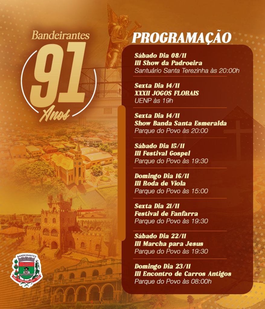 BANDEIRANTES - Bandeirantes celebra seus 91 anos de emancipação política em grande estilo, com uma programação festiva repleta de atrações que prometem movimentar a cidade e agradar a todos os públicos. As festividades, que mesclam cultura, fé e tradição, são um convite para que moradores e visitantes celebrem juntos mais um ciclo da rica história do município.