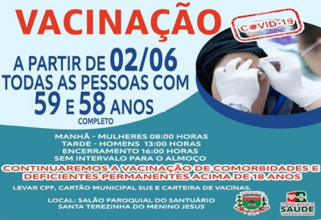 VAMOS INICIAR A VACINAÇÃO DE PESSOAS COM 59 ANOS. NESTA QUARTA-FEIRA, 02/06/2021 FAREMOS A VACINAÇÃO DE TODAS AS PESSOAS COM 58 ANOS QUE AINDA NÃO FORAM VACINADAS. PRESTE ATENÇÃO NOS HORÁRIOS DIFERENCIADOS PARA MULHERES E HOMENS.