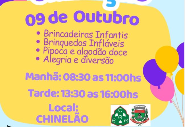 BANDEIRANTES - A alegria e o encanto do Dia das Crianças estão garantidos em Bandeirantes com dois eventos especiais organizados pela Secretaria Municipal de Assistência Social e Assuntos da Família, CMDA, CREAS e pelo Departamento de Esportes (CREM). As festividades começam no dia 9 de outubro, quando o CREM abrirá as portas do Chinelão para receber as crianças em dois períodos: matutino, das 8h30 às 11h, e vespertino, das 13h30 às 16h. O evento promete ser um dia repleto de diversão, com brincadeiras infantis, brinquedos infláveis, e as delícias de pipoca e algodão doce para adoçar o dia.