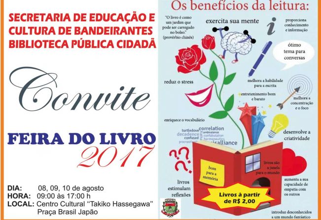 A Prefeitura de Bandeirantes, através da Secretaria de Educação e Cultura, e a Biblioteca Pública Cidadã ‘Jamil Fares Midauar’ realizam nos dias 08, 09 e 10 da próxima semana, a Feira do Livro 2017