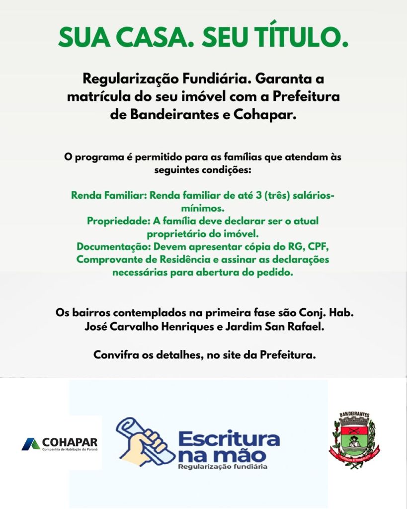 BANDEIRANTES - A Prefeitura Municipal de Bandeirantes , por meio da Secretaria Municipal de Política Habitacional , em parceria com a Companhia de Habitação do Paraná (Cohapar), está aderindo ao Programa Paraná Regularizado. O objetivo da iniciativa é promover a política habitacional de interesse social através da regularização fundiária de núcleos urbanos informais consolidados em áreas públicas.