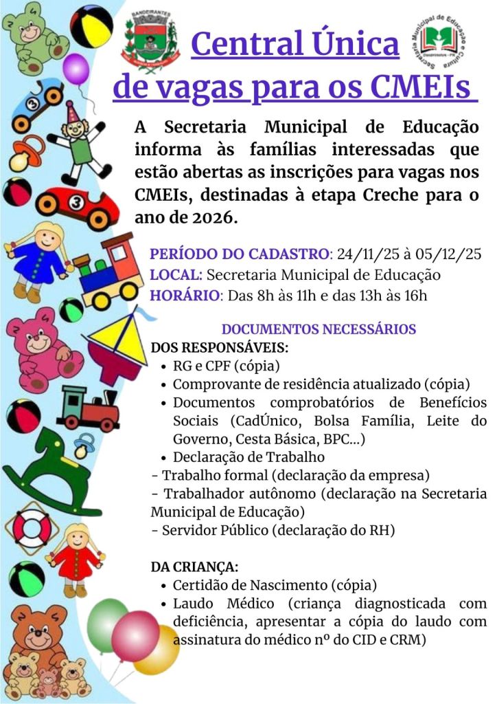 BANDEIRANTES - O acesso às vagas nos Centros Municipais de Educação Infantil (CMEIs) está passando por uma reformulação significativa no município, marcando um avanço na Política Pública de Educação Infantil. Com a criação e implementação da Lei da Central de Vagas, o processo de inscrição, que antes era realizado diretamente nos CMEIs de interesse da família, agora está unificado e centralizado.