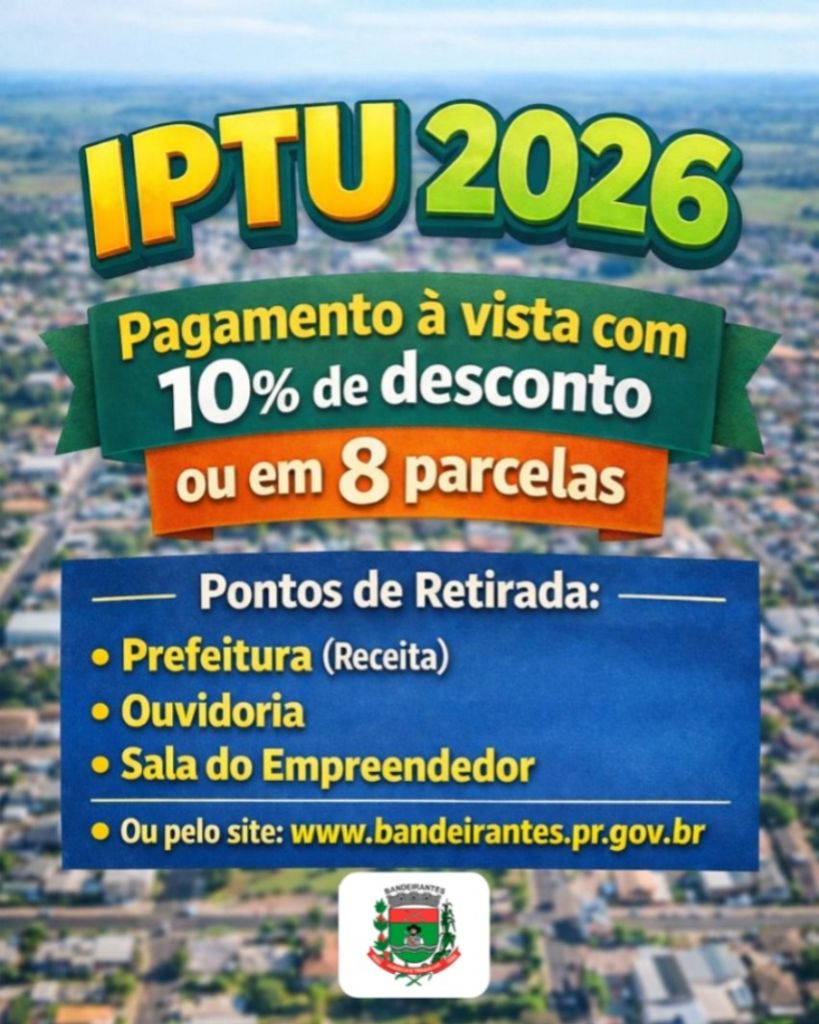 BANDEIRANTES - A prefeitura definiu as regras para o pagamento do IPTU 2026. É importante lembrar que o valor arrecadado com o imposto retorna para você através da prestação de serviços e de melhorias constantes em todo o município.