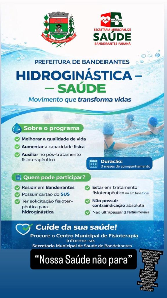 BANDEIRANTES - O cuidado com a saúde física muitas vezes exige caminhos que vão além do consultório tradicional. Em Bandeirantes, o projeto de Hidroginástica – Saúde surge como uma extensão do tratamento fisioterapêutico, utilizando as propriedades da água para facilitar movimentos que, em solo, poderiam ser dolorosos ou limitados.