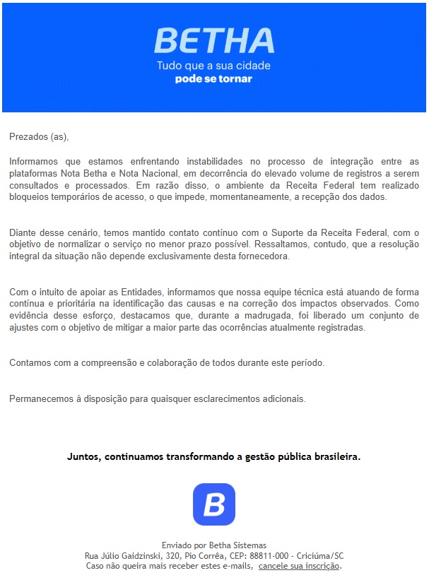 A fim de evitar possíveis erros ou cancelamentos de notas, recomendamosaguardar a resolução dessa instabilidade, para que prossigam com emissão das notas.